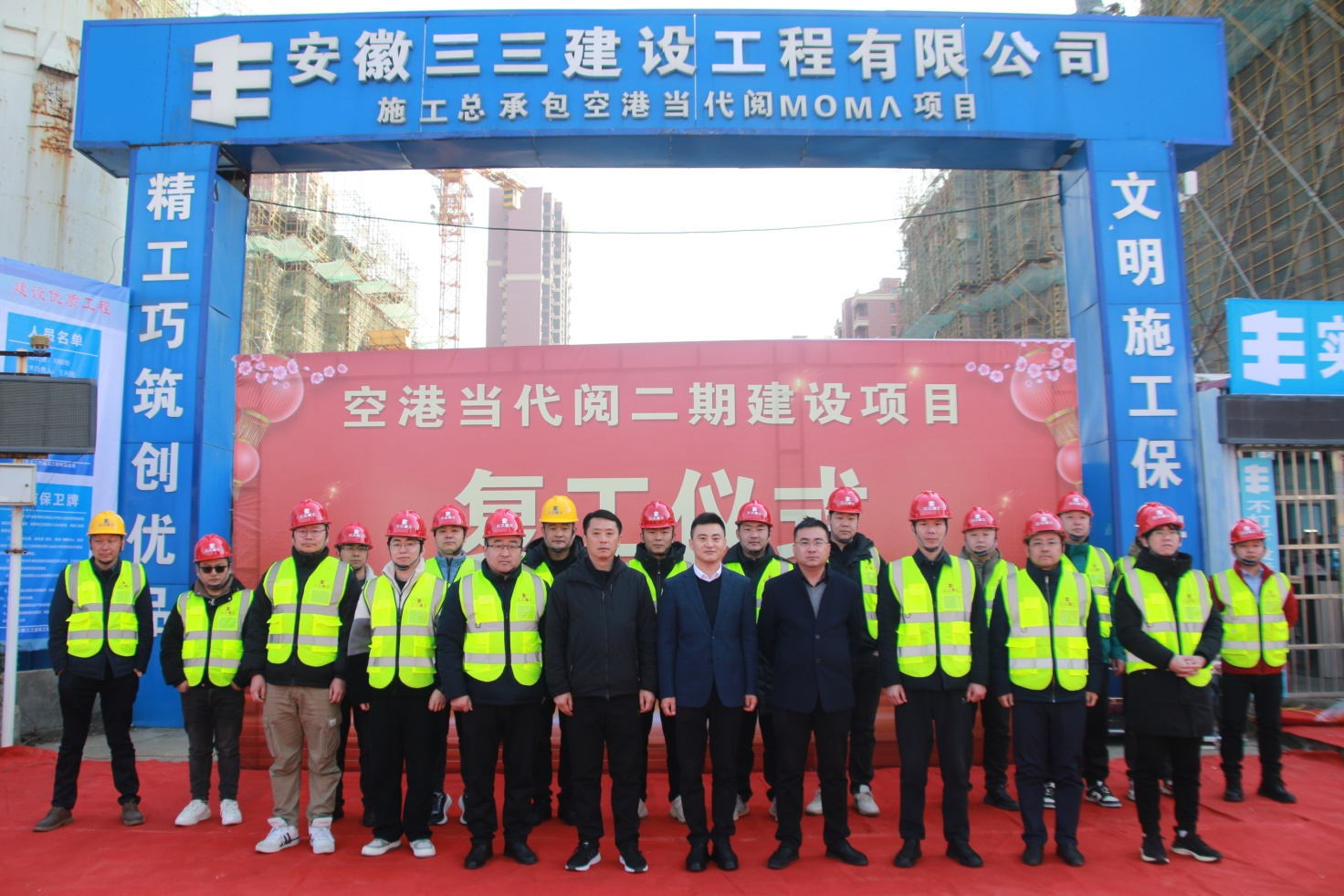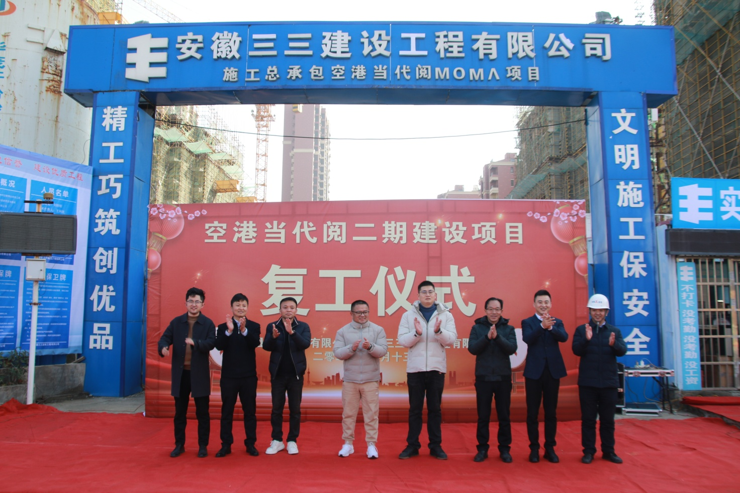 2025年2月13日(正月十六)上午9時58分,在壽縣新橋國際產業園內的空港當代閱二期建設項目現場鞭炮齊鳴,熱鬧非凡,項目復工儀式正在此舉行。壽縣經開區自規局朱濤局長、不動產登記中心蔣國斌主任、重點局鮑龍主任、新橋投資公司投融資部楊智勇總經理以及壽縣原綠置業公司總經理陳自闖、南巽監理公司總監汪衛民、三三集團總裁兼三三建工執行董事宋曉光、三三建工總經理王利民、二期購房業主代表等領導和嘉賓蒞臨現場,共同見證這一新篇章的開啟。復工儀式由宋曉光總裁主持。